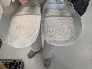 Different buckwheat flour formulations are being tested by evaluating different milling techniques. This photo shows light (left) vs. dark (right) buckwheat flours, which have different flavor and texture properties.