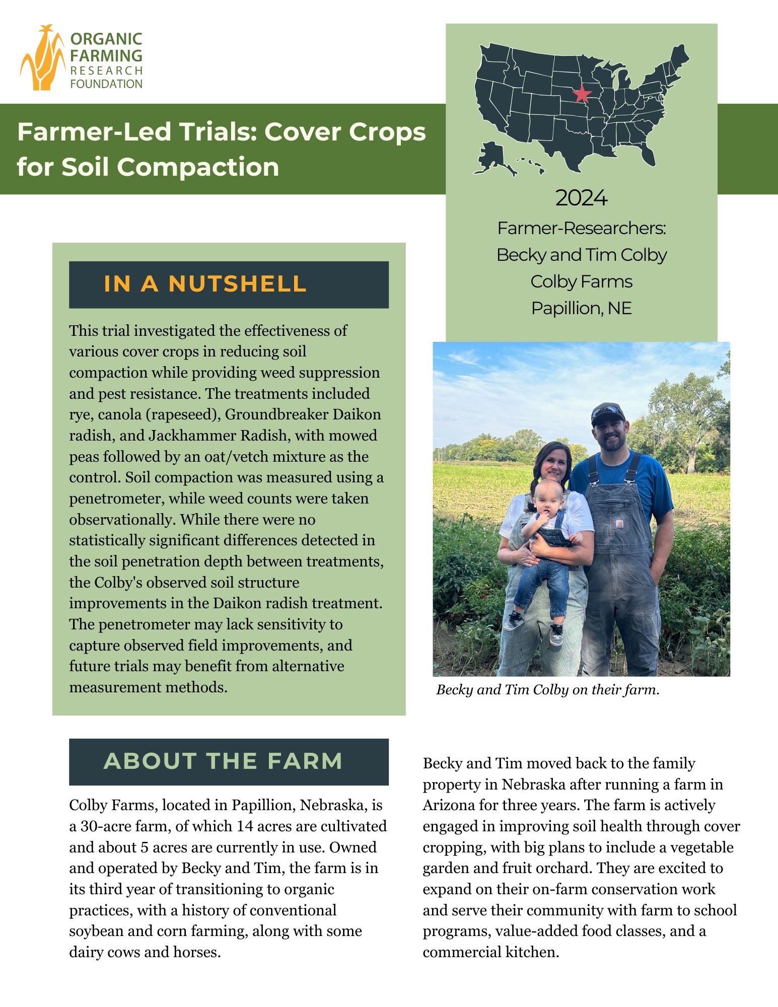 Tim and Becky know that dealing with soil compaction goes beyond just planting deep-rooted cover crops. They have plans to use reduced tillage practices, and create permanent beds and living walkways in order to minimize soil compaction. All these measures will contribute to a healthier soil structure. At OFRF, we are excited to be a part of the Colby’s learning journey, and hope that their work will inspire more farmers to conduct research trials on their farms.