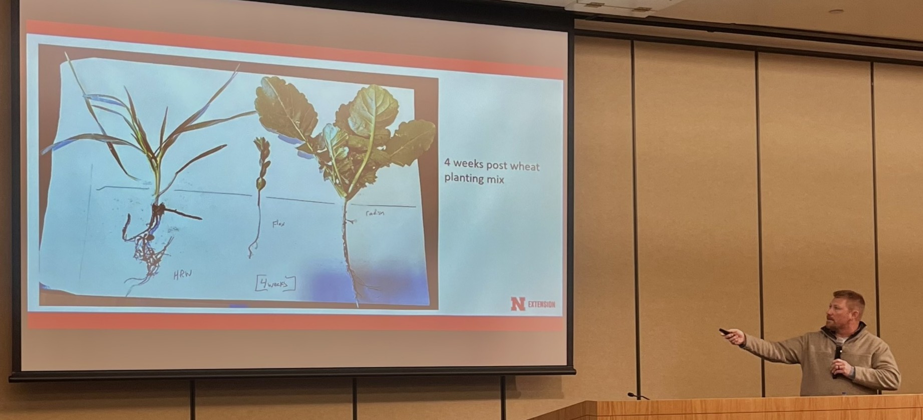 Organic farmer Barry Young explains his polyculture planting mix for organic wheat, which includes a custom mix of 120 pounds of wheat with 2 pounds of radish and 3 pounds of flax. The flax, a legume, helps enhance the soil microbiome while the radish helps break compaction especially following alfalfa. Both winterkill and the wheat matures as a pure stand for harvest the next season.