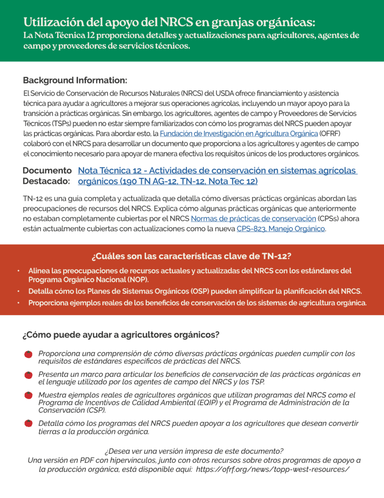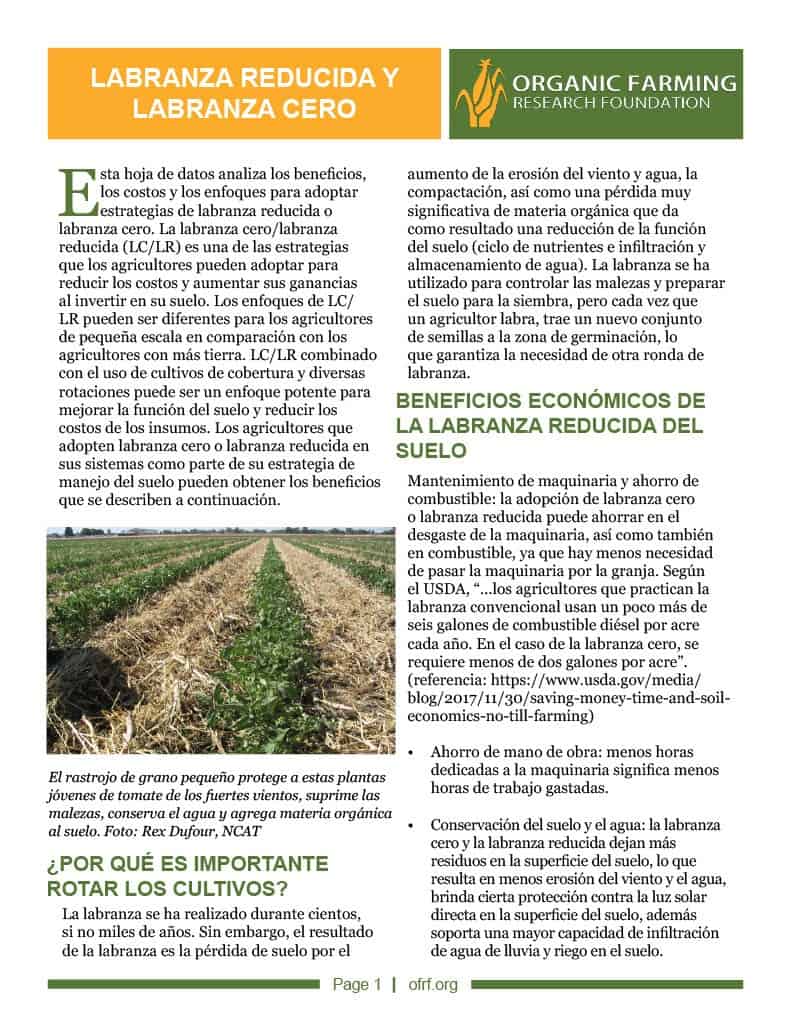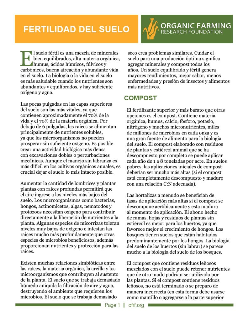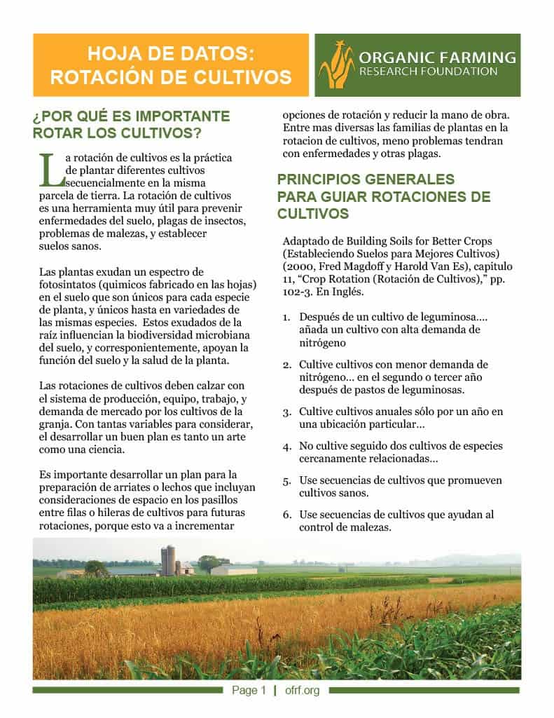La Fundación para la Investigación de la Agricultura Orgánica (OFRF por sus siglas en inglés) se complace en anunciar un nuevo curso asíncrono en línea que cubre la importancia de la salud del suelo para la producción agrícola. En este curso entraremos en el mundo del suelo y explicaremos cómo puedes promover la salud del suelo como parte de un ecosistema saludable. Los suelos saludables permiten aumentar la producción con menores costos, y hace que su negocio agrícola sea más productivo económicamente, a la vez que favorece la salud del medio ambiente, los animales, y los seres humanos. Analizaremos prácticas como el cultivo de cobertura, aplicación de enmiendas, la labranza y la rotación de cultivos, y proporcionaremos herramientas para ayudarle a decidir qué prácticas de gestión se adaptan mejor.