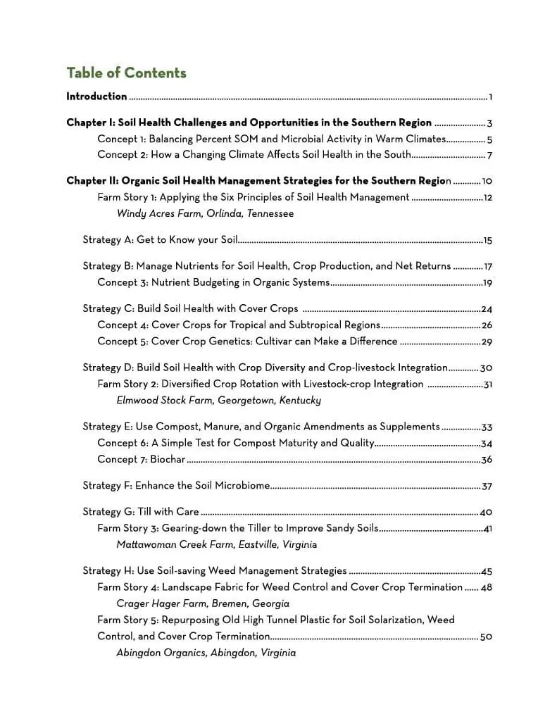 Healthy, living soils provide the foundation for successful and profitable organic farming and ranching. Nowhere is soil health more vital than in the South, where organic producers face intense pressure from weeds, insect pests, parasitic nematodes, and plant-pathogens; extremes of summer heat, drought, and flood; and soil types with inherent fertility limitations. In addition, long growing seasons can make it harder to rebuild soil organic matter, especially during intensive crop production. Scroll below to preview the table of contents. Filling out this form will automatically sign you up for OFRF’s monthly email newsletter.